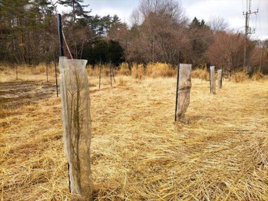 植えられたカエデには食害防止ネットが巻かれていた