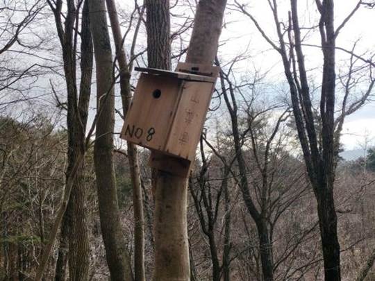 自衛隊演習地から砲弾の腹に響く音が聞こえてきていた。落葉広葉樹の葉が落ちきった林のなかを黒いネクタイをしめたシジュウカラや褐色の胸毛のヤマガラが枝から枝へと伝わっていく。私は落ち葉を踏みしめながら紅葉台へと登って行った。巣箱が山道の脇に取り付けられていたので、果たして利用されているのかどうかを確認するために蓋を開けてみると、利用された形跡はなかった。巣箱は登山者が歩く山道脇に取り付けるのではなく、野鳥たちが安心して利用できるように山道から10mは距離を置くべきだろう。