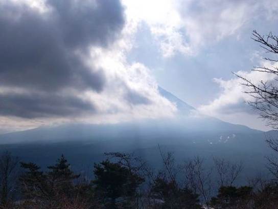 歩いている途中で予定コースから外れていることがGPSで分かったので、獣道を登って予定ルートである東海自然歩道に戻った。木の階段で整備された山道を登っていくと、林の木の間越しに西湖が見えた。「関東の富士見百景」に選ばれている紅葉台(標高1165m)に着いたのはバス停から歩きだして40分が経っていた。展望レストハウスは平日のためか閉まっていた。正面に見える富士山の左側3分の2は雲に隠れており、右側3分の1だけが姿を現していた。太陽は雲間から顔を出し始めており、シカの鳴き声が絶え間なく届いていた。この紅葉台の富士山絶景ビューポイントは、木の高さが4〜5mほどの高さで伐られており、富士山がよく見えるようになっていた。東から西へと風が吹いており富士山の山頂部が見えだしていた。徐々に富士山がその姿を現していくので、30分も経てば富士山が全貌を表すだろう。