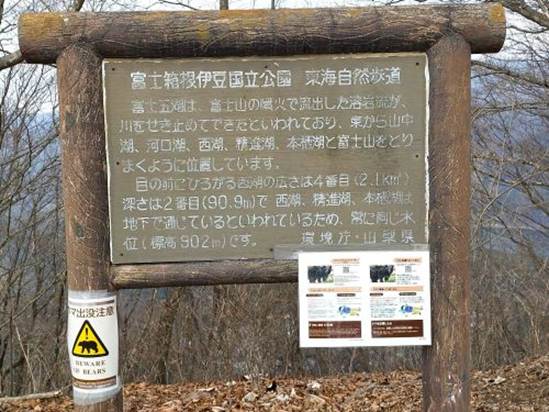 広場には環境庁・山梨県がたてた富士五湖の説明文があった。その説明文には「富士五湖は富士山の噴火で流出した溶岩流が川をせき止めてできたと言われており、東から山中湖・河口湖・西湖・精進湖・本栖湖と富士山を取り巻くように位置している。目の前に広がる西湖の広さは4番目で2.1ku、深さは2番目で90.9m、西湖・精進湖・本栖湖は地下で通じていると言われているため、常に同じ水位標高902mです」とのことで、その看板に「クマ出没注意」と「熊を目撃したら」という日本語と英語の注意書きが貼られていた。最近はどこでもクマ・クマ・クマであるが、1月になったのでクマたちは冬眠(仮眠)に入っているだろう。