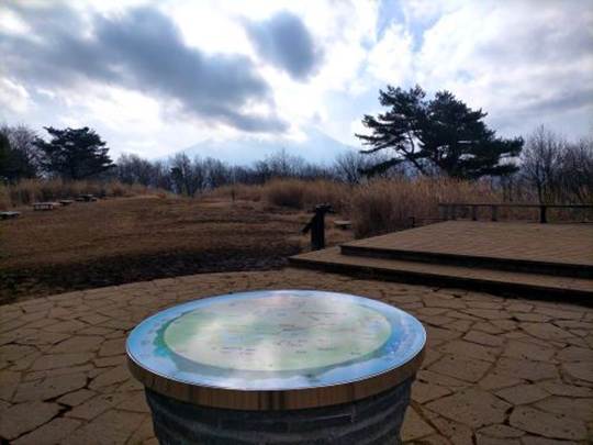 山道は徐々に標高を上げていた。三湖台(標高1202m)に着くと、広い展望台になっており、テーブルやベンチが置かれ東屋も建っていた。展望台の中央に円形の山名表示盤が置かれ、周りの山々の名前が表示されていた。台地の名前となっている「三湖とは西湖・精進湖・本栖湖の3つがこの台地から見えていたということで三湖台の名がついた」とのことだ。西の方を見ると青木ヶ原樹海の向こうに精進湖と本栖湖が見えた。