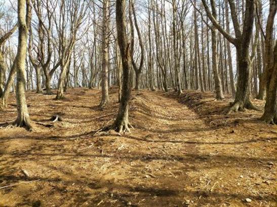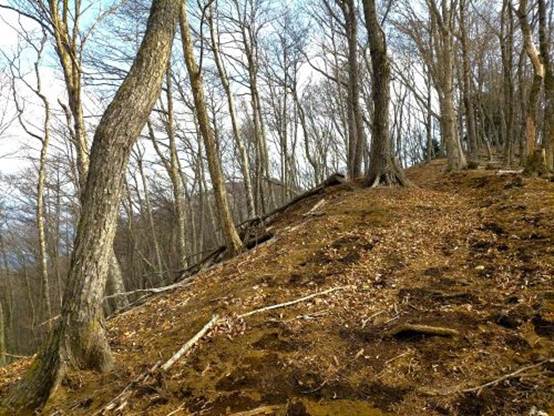 三湖台から足和田山に向かう山道は木漏れ日のなかを気持ちよく歩くことができた。落ち葉を踏むカサコソ・ガサゴソという足音が付いてくる静かな雑木林のなかを歩いて行った。ブナ・ミズナラ・コナラの林のなかをコガラの群れが通り過ぎていった。先ほどはホオジロの姿も確認できた。昨年はブナの実やドングリの実が不作で、森のなかで生活する動物たちの餌が少なく大変だったようだ。静かな林のなかでは落ち葉を踏みしめる音とザックにつけたクマ鈴だけが鳴っていた。