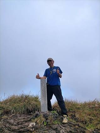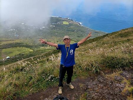 お鉢まわりを歩き出して20分で西山・八丈富士の山頂に着いた。先ほど追い抜いた若い女性がやってきたのでスマホのシャッターを押してもらった。私もお返しにシャッターを押してあげた。海が台風の影響で荒れそうなことを話すと、彼女は今日の飛行機で帰るとのことだった。