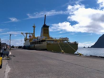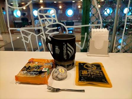7時30分から4甲板のレストランがオープンしたので、お湯をもらいに出かけた。自動販売機の奥に給湯器があった。ジェットボイルのなかに500mlのお湯を注いで味噌ラーメンを入れ、ほどよくふやけてきたところにレトルトカレーを入れて味噌カレーラーメンにして食べた。身体が芯から暖かくなった。ラーメンを食べたあと大福餅をひとつ食べて朝食を終えた。
