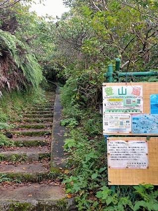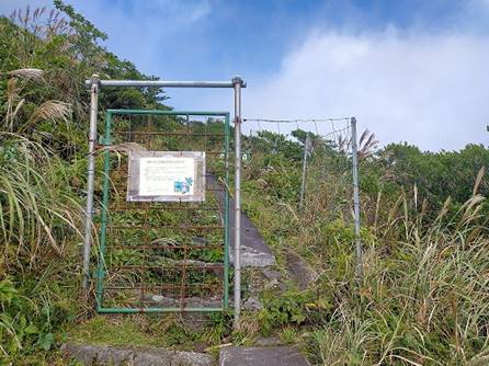 石段の半分看板からしばらく登ると、八丈島の植生を保護し八丈富士を守るために獣害防止柵が設置され、登山者は扉を必ず閉めてくださいと書かれていた。獣害とは千葉県で大繁殖しているシカの仲間のキョンのことだろう。先ほどまで見えていた底土港や町は霧に覆われて真っ白くなってしまった。天候がころころ変わり不安定である。