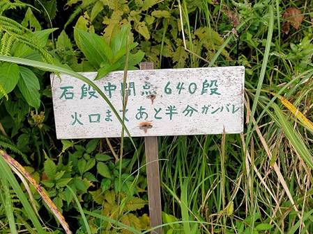 登り始めて20分が過ぎたころ「石段中間点640段 火口まであと半分 ガンバレ」という手作りの看板が立っていた。ちょっとペースが早いかもしれないので、ゆっくり登っていこう。後ろを振り返ると八丈島空港の向こう側に東山(三原山)が見えたが、頂上付近は雲に覆われていた。これから登っていく西山の頂上も雲に覆われているようだった。