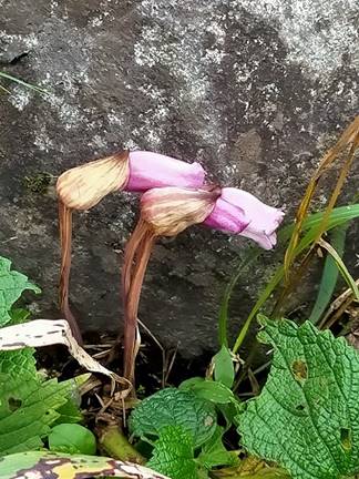 石段を登っていくと足元にピンクのナンバンキセルが咲いていた。花の形がキセルの首に似ているのでナンバンキセルと呼ばれているが、初めて目にする花である。細長い形の花なので馬面だ。周りにも何株かナンバンキセルが小さな花を咲かせていた。