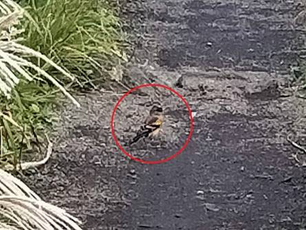 石段を登り終わり登山道の傾斜が緩くなった地点で1羽の野鳥が眼の前に舞い降りた。距離は3mほどである。黒・白・黄色・橙が混じった綺麗な野鳥である。過去の野鳥観察から冬鳥のアトリであることを思い出した。アトリは群れで生活しているのだが、1羽だけだった。