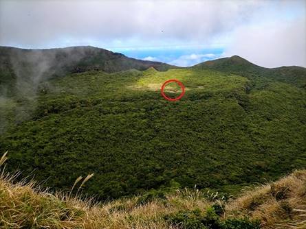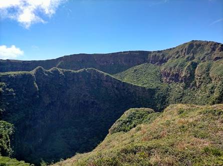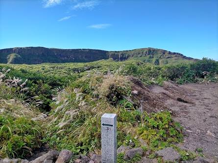 登山口から登りだして40分で、お鉢まわりの分岐に着いた。火口の大きさは直径約500mである。空には5mほどの低さで数羽のイワツバメが舞っていた。この近くの火口壁にイワツバメの巣があるのだろう。お鉢まわりは「天空への道」と呼ばれており、火口壁の縁をぐるりと回ることである。これから時計回りにお鉢を回っていこう。ちょうど火口壁の反対側に1人の男性が歩いているのが見えた。私の前に登山口で出会った女性2人が歩き出していた。登山口では長袖を着ていた女性たちは半袖シャツになっていた。