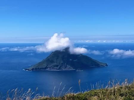 お鉢まわりを進んでいくと尖った八丈小島が紺碧の海に登場してきた。群青色をした素晴らしい海の景色だ。小島の頂上にも雲がかかっていた。八丈小島は周囲が絶壁なので上陸することは困難だろう。小さいが尖がった格好いい島だと感じた。休憩を取りながら暫く紺碧の海と八丈小島の景色を眺めていた。