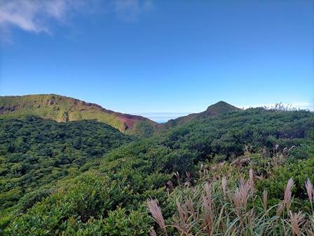 お鉢まわりまで50分という看板が立てられていたので、ゆっくり登っても1時間くらいだろう。私の前をレンタカーでやってきた2人の若い女性が登って行った。ススキの生い茂った階段を登っていく。今日は十五夜である。家を出る時に花見川の土手でススキを切って自宅の花瓶に挿してきたことを思い出した。周りからツクツクホウシの声が聞こえてきていた。風が止んでいるため蒸し暑く、額からは汗が滴り落ちていた。