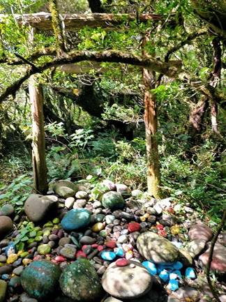 火口のなかは常緑広葉樹やシダが生い茂っているので湿っていた。火口に降り出してから20分ほどで浅間神社に着いた。昭和45年8月吉日と記したコンクリートの鳥居と、今にも朽ちそうな木の鳥居が立ち、木の鳥居の奥に小さな石の祠が3つ祀ってあった。お賽銭がたくさん供えられており、木の鳥居の下に好きな言葉を書いた色を着けた丸石がたくさん供えられており、ドラえもんを描いた石もあった。丸石は絵馬のようなものだろう。