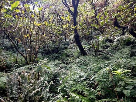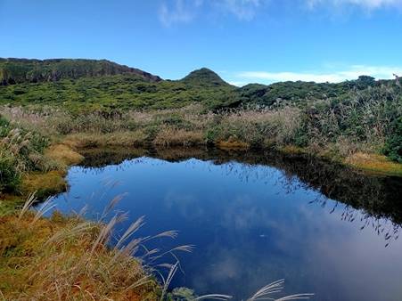 足元に覆い茂るシダをかき分け、細い木が密集しているなかや足元も見えない藪をくぐっていると、ハワイのホノルルマラソンを走った時に訪れたジュラシックパーク撮影地のジャングルのなかを歩いている気分だった。やがて中央火口丘内の池に着いた。お鉢まわりをしていた時に火口の中央に見えていた丸い池だ。風は全くなく静かな池の水に空の青が反射し、火口の垂直の壁が池に映っていた。音が全くなかった。実に静かなひと時が流れていった。池の周りの草は黄色く色づき始めていた。
