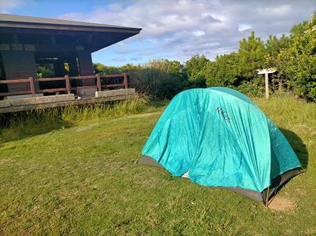 底土キャンプ場のテント場は3箇所70張り収容だが、今日は外国人夫婦と私だけである。バーベキュー場で若者3人が準備をしていたが、彼らはバーベキューを食べれば宿に帰るだろう。シャワーで汗を流した後はテント前で宴会のスタートである。10月になっても蚊が飛んでいて、随分あちこちを刺されてしまって痒い。天気予報を確認すると今晩の21時から24時頃と明日の明け方3時から5時頃に小雨が降ると出ていたので、芝生の上のテントを東屋のなかに引っ越した。実に静かなテント場で聞こえてくるのは潮騒のみだ。今晩はこれがBGMになるのだろう。