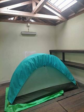 7時30分に町の防災無線で今日の定期船は欠航になったと放送があった。昨夜竹芝桟橋を出航した定期船『橘丸』は、八丈島底土港桟橋の波が高くて着岸できないために、三宅島でUターンして竹芝桟橋に戻ってしまったのだ。昨日乗船予定を前倒しに変更したのだが、船が欠航して東京へ帰れなくなってしまった。残念だが仕方がない。雨の降っていない時に歩いて15分の商店に行き、缶ビール500mlを6本と島焼酎1本と缶詰、ラーメンを買いたした。さらに強烈な台風の襲来に備えて東屋内にあったテントを、非常事態のためシャワー棟内の更衣室に移した。本来ならば東屋内や更衣室内でのテント設営は禁止されているのだが仕方がない。ここならば風雨に対して万全だろう。