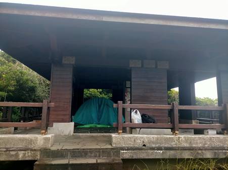 底土キャンプ場は海のそばに造られている。寄せては返す漣のような潮騒ならば快いBGMだろうが、海が荒れ強風が吹いているために一晩中ザザザ〜・ドバ〜ンという大きな音が途切れることはなかった。昨日のうちに芝生の上から頑丈な東屋のなかにテントを移していたので、雨が降りだし風に叩かれても被害はなかった。