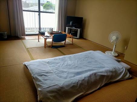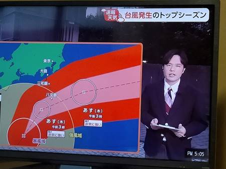 宿のチェックインは通常は14時からだったが、非常事態のため9時からにしていただき、ありがたかった。宿は白いコンクリート製の3階建てで、フロントの受付は昨日電話に出た男性だった。私の部屋は2階で手前にフローリングがある8畳の和室だった。これでどんな強力台風が来ても万全だ。台風のため明日は公共施設も休むとのことだ。町の防災無線が度々厳重注意を繰り返し、テレビでは気象庁が臨時会見し、今まで経験したことのない大型台風なので厳重な注意を呼びかけ、最大瞬間風速は70mという放送を流していた。