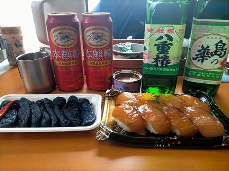 雨森商店から歩いて10分ほどで八丈島最大のスーパーに着き、食料品コーナーでヒラマサの島寿司とピリ辛ナス漬けを買った。スーパーの駐車場は食料品を求める人たちの車で満杯だった。やっぱり島の人たちも食料確保に必死のようだった。キャンプ場の近くには生ものを扱う商店がなかったので、生ものを食べられなかった。島寿司は漬け寿司だが、久しぶりに生ものが食べられるので嬉しかった。宿に戻って早速乾杯だった。