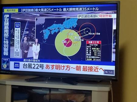 16時10分 今回の台風22号で特別警報が出されるかもしれない、とニュースが伝えている。伊勢湾台風や東日本大震災に匹敵する特別体制とのことだ。