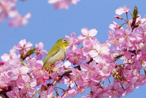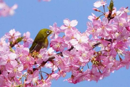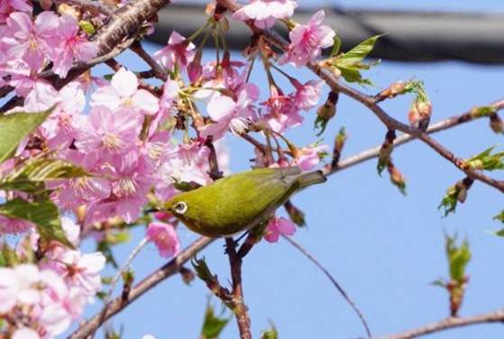 自宅マンションの北側に900年前の鎌倉時代創建と伝わる三代王神社があり、神社の東に1本のカワヅザクラが植えられている。その花が満開である。花の蜜を求めてメジロやヒヨドリがやってくるのを待った。空は雲ひとつなく晴れあがっていた。果たしてカワヅザクラの花にメジロやヒヨドリはやってくるのだろうか?
