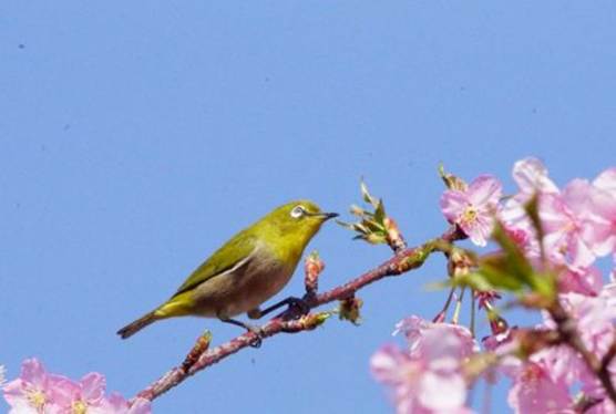 幕張でもあちこちでカワヅザクラが満開となっていた。ウメの花も満開である。野鳥たちにとっては、あちこちで蜜を吸うことかできる状況だったので、果たしてこの木にやってくるのだろうか?と心配していたが、50分ほど待っているとジュジュいう小さな鳴き声とともに1羽のメジロが飛んできた。メジロはせわしなく花から花へと渡りながら蜜を吸い、素早く飛び去ってしまった。