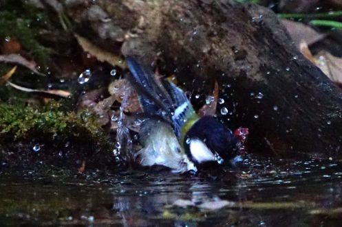 シジュウカラが水浴びを始めた
