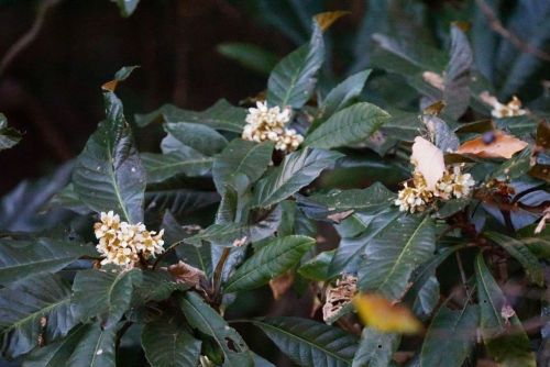 ビワの白い花が咲き出した