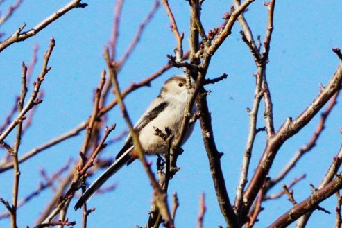 親水広場に向かう途中でエナガの群れがウメの木で餌を探しているのに出会った。約15羽の群れを暫く見ていたが、虫を探しあてたエナガはいないようだった。越冬する虫は、枝の割れ目や樹皮の下に潜んでいるのだが、それを見逃さずに探し出す野鳥の技には脱帽である。