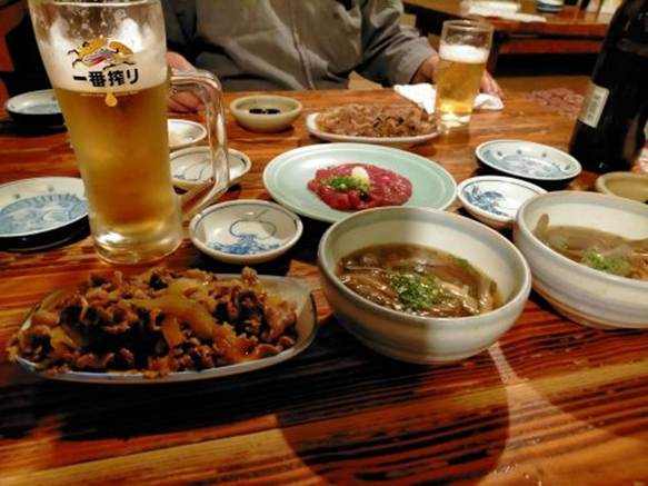 最初に予約している人が店内に呼ばれ、しばらく経つと次々に縄暖簾をくぐって店内に入っていった。座敷に上がり生ビールと同時に注文したツマミは、馬刺しの赤身、牛肉煮込み、ドジョウ煮込みだった。人気店のために滞在は2時間と説明された。