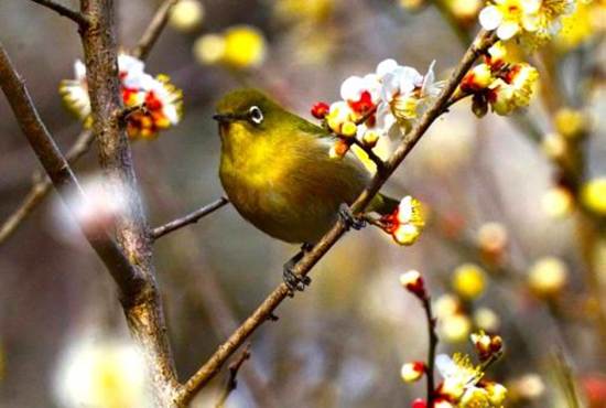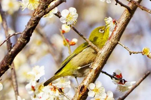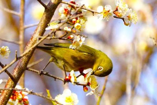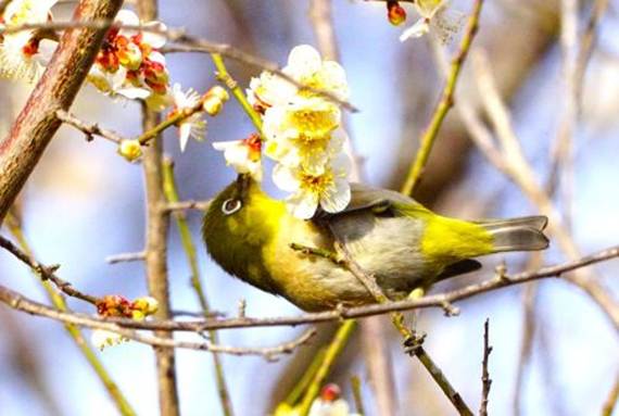 ウメの蜜を吸うメジロ