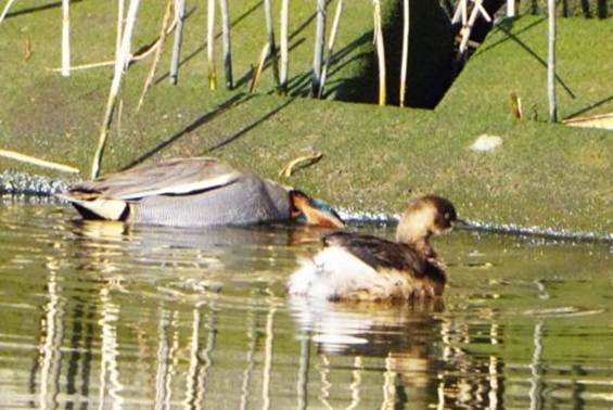 ハジロカイツブリの横で食事中のコガモ