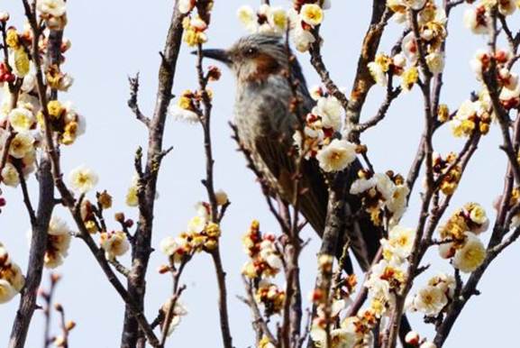 11時50分に花島公園運動広場のウメ林に着くと、ほのかな甘い香りを漂わせて白いウメの花が咲いていた。ウメの木は3本を残して他は枯れてしまったので、新しく7本のウメの幼木が植えられていた。1時間ほどメジロがやってくるのを待つことにした。最初にやってきたのは2羽のヒヨドリだった。ヒヨドリを撮影しようとするが、ウメの枝がヒヨドリと煩雑に絡み合い、ヒヨドリにピントが合わせづらかった。1時間ほどメジロを待ったがメジロは現れなかったので、花島橋を渡って野鳥観察場所に向かった。