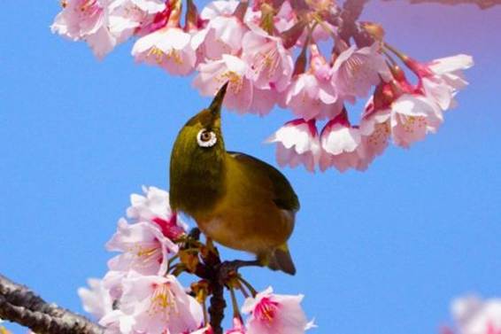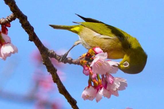 カンザクラの蜜を吸うメジロ