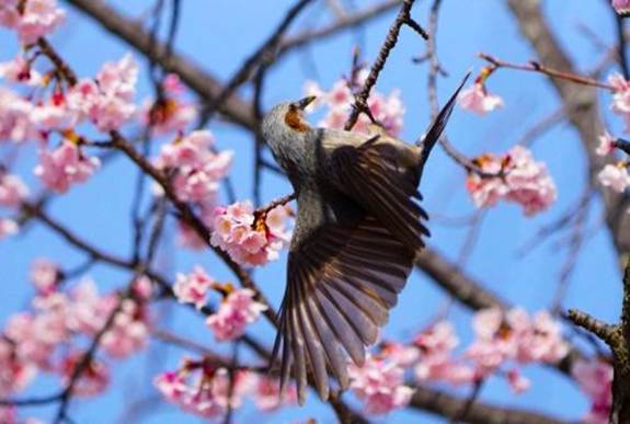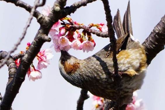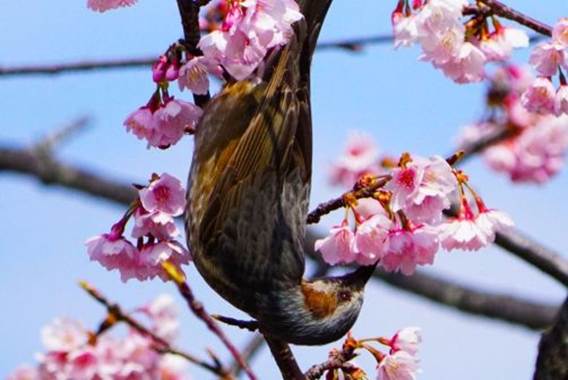 花はいっぱい咲いているのだから、仲良くしながら蜜を吸えばいいと思うのだが、ヒヨドリの世界はそうでもないらしく、後からやって来た仲間を追い払いながら蜜を吸っている。ヒヨドリは大きな身体をしているが、想ったよりも身軽で枝に宙吊りになりながらも嘴が花心に入るように首を曲げながら蜜を吸っている。サクラの花は上向きで咲かずに下向きで咲くので、蜜を吸う場合はどうしても宙づりになりながらの体勢となってしまうのだ。