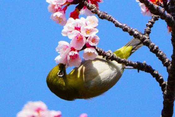 次に現れたのは20羽ほどのメジロの集団だった。枝のあちこちで蜜を吸っているので、どの個体に焦点を当てるのか戸惑うこともある。メジロもヒヨドリと同じように枝を掴んで宙づりになって花心に嘴を差し込んで蜜を吸っている。チィチィ鳴きながら蜜を吸いつつ花から花へとせわしなく移っていった。鳴き声でお互いの意思を取り合っているのだが、集団のなかにリーダーのようなものがいるらしく、カンザクラの木から1羽が別の方向に飛び出すと、次々に鳴き声と共に去っていった。