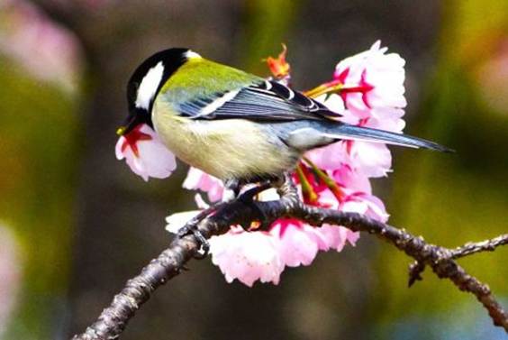 次にやってきたのは2羽のシジュウカラだった。シジュウカラは花房の元の若い芽を食べているようだった。最初は花の蜜を吸うことなく緑の萼の部分をほじくるように食べていたが、観察していると花房の元を嘴で折って嘴にくわえ、そこから蜜を吸っていた。このようなシジュウカラの姿を見るのは初めてだった。
