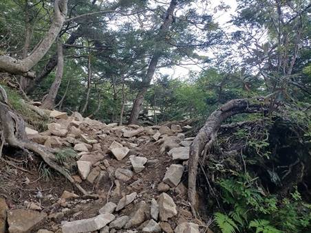 針葉樹の森のなかは急登だった。岩角や木の根っこを掴みながら、四つん這いで登っていった。登山道には岩クズが散乱して歩きにくく、クマザサと針葉樹の森のなかをひたすら登っていった。風は止まっており汗が全身から流れていた。急登の途中で降りてきた男性登山者に出会った。彼が言うには「このルートは急だけれど整備されている。山頂にいた人の殆どが菅沼からの登山者だった。私は湯元から向こう側を登ったが、とんでもないササ藪で身体はササに隠れて足元が見えない酷さだった」とのことだ。深田久弥選定の『日本百名山』の奥白根山には群馬県側から登る人が多く、栃木県側から登る人はごく僅かなのだろう。群馬県側のロープウェイや、最短距離の菅沼から登るのが楽なのである。
