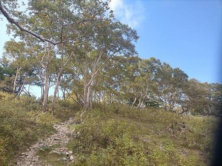 外山を過ぎると少しの間だけ登山道は傾斜の緩い散歩道となった。やがて前白根山への登りとなると徐々に傾斜は増したが、黄色に色づき始めたダケカンバの林を登っていくので、今までの針葉樹の暗い森とは異なり明るくて心も弾み気持ちが良かった。