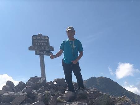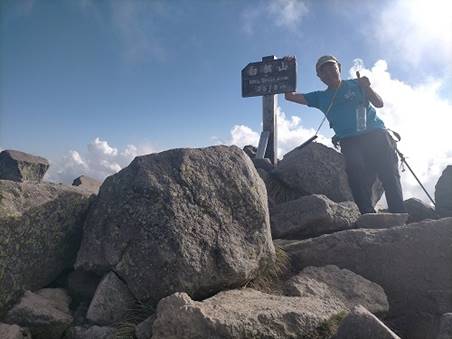 頂上近くになると細かい砂礫の登山道を歩いて大岩が重なる広い山頂に着いた。山頂にも火山湖があったが、日照りのために水は干上がっていた。その脇に1つ目の山頂があり奥白根神社が置かれていたので参拝した。爆裂火口のなかを覗き込むと水が溜まっていたのが見えた。落ちたらアウトの岩場を通って岩が重なる2つ目の山頂に着いた。三角点が打たれ白根山(標高2578m)の山名表示板が立っていたので、逆光だったが登頂記念写真を撮った。3つ目の山頂は少し離れた場所に見えた。周りの山々は雲に覆われ始めていたが、奥白根山と前白根山の山頂には陽が差していた。時間も遅かったので山頂には私のほかには誰もいなかった。ひとり占めの山頂で10分ほど休憩して避難小屋に向かって降りだし、急傾斜なので転倒に注意しながら50分後に避難小屋に着いて1日目の行動は終わったのだった。