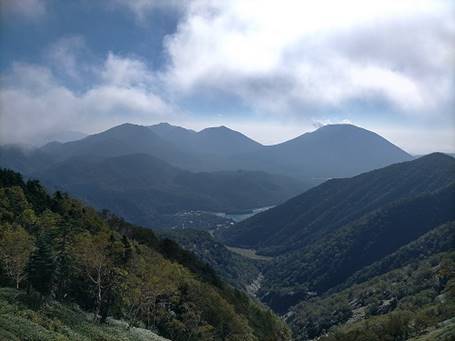 ササ原の中を降りて行くとガスが飛んで青空が拡がりだし、昨日登ってきた奥日光湯元温泉スキー場がよく見えた。前方には右から男体山、大真名子山、小真名子山、女峰山、太郎山という日光を代表する5山が一望できる絶景の場所に出た。素晴らしい。男体山と白根山には既に登ったので、来年は太郎山、大真名子山、小真名子山、そして鋭くそびえる女峰山に登ろうと想う。左奥には赤城の山々も見えていた。