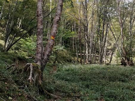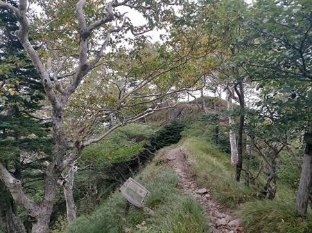動物の足跡が多数残る国境平に着いたので暫く休憩した。登山道はササ原のなかを降り続けているので、ササの海のなかを迷っているような感じだ。私の背よりも高いササが密集し、足元も定かでないなかをくぐっていく場合も度々あった。そのなかで1mほどの段差があったが、段差の中央に木の根っこ出ていたので、大丈夫だろうと想って根っこに体重をかけたところ、その根は片方が切れており、そのまま私はもんどりうって転落した。左手に掴んでいたササをしっかり握っていたので大事に至らなかったが、右手に持っていたトレッキングポールが私の下敷きになり、グリップの下で真っニつに折れてしまった。私の足の代わりにトレッキングポールが折れたのだった。何が起こるか分からないヒヤリとした瞬間で、再度気を引き締めるアクシデントだった。
