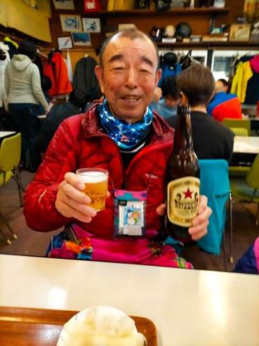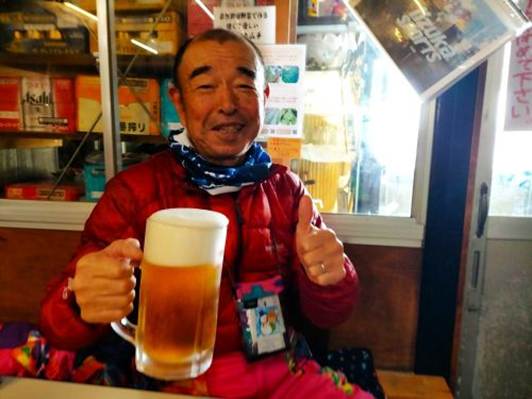 休憩後に第2ラウンドのミルキーウェイを2本滑って、再びお祭り広場に戻ると室内はほぼ満席で、運よく5人の家族連れと交代してテーブル席に座ることが出来た。まずは生ビールの大ジョッキで乾杯だった。ツマミはコロッケとモツの煮込み、白菜や大根の漬け物だった。ビールのあとは日本酒だった。冷蔵庫で冷やした青竹を切った盃に冷やした酒が心地よく喉にしみていった。美味かった。