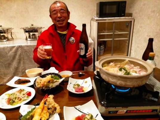 11時まで30分ほどカフェオレを飲みながら休憩し、第2ラウンドをスタートした。2日目の2ラウンドともなると、脚も疲れてきているのでミルキーウェイを3本滑りおりることにした。ゴンドラで山頂駅から滑りおりてくると約30分かかるので、3本で1時間半だった。昨日と同じ12時30分に今日の滑りは終了し、居酒屋『お祭り広場』に入った。昨日とは違って室内は比較的空いており、ゆとりがあった。まず頼んだのは札幌ビール赤星の大瓶3本だった。それをネギチャーシューやピザ、白菜や大根をツマミに飲んだあと日本酒に移った。ツマミは揚げ餃子だった。日本酒を飲み終えると宿からの迎えの時間となった。
