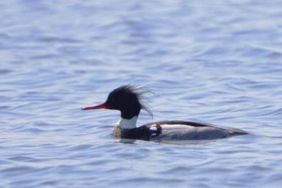 汀線が随分後退したので沖の方に歩いていき双眼鏡で眺めると、特徴的な頭の羽がぼうぼうとしているのが3羽波間に浮かんでいた。望遠レンズで再確認すると、今日遭いたかったウミアイサだった。望み通りにウミアイサに出遭えたのは実にラッキーである。